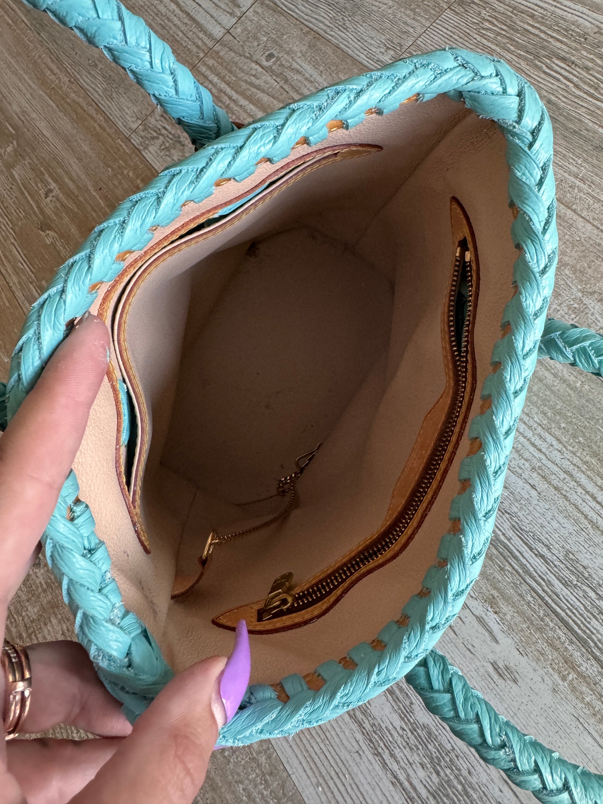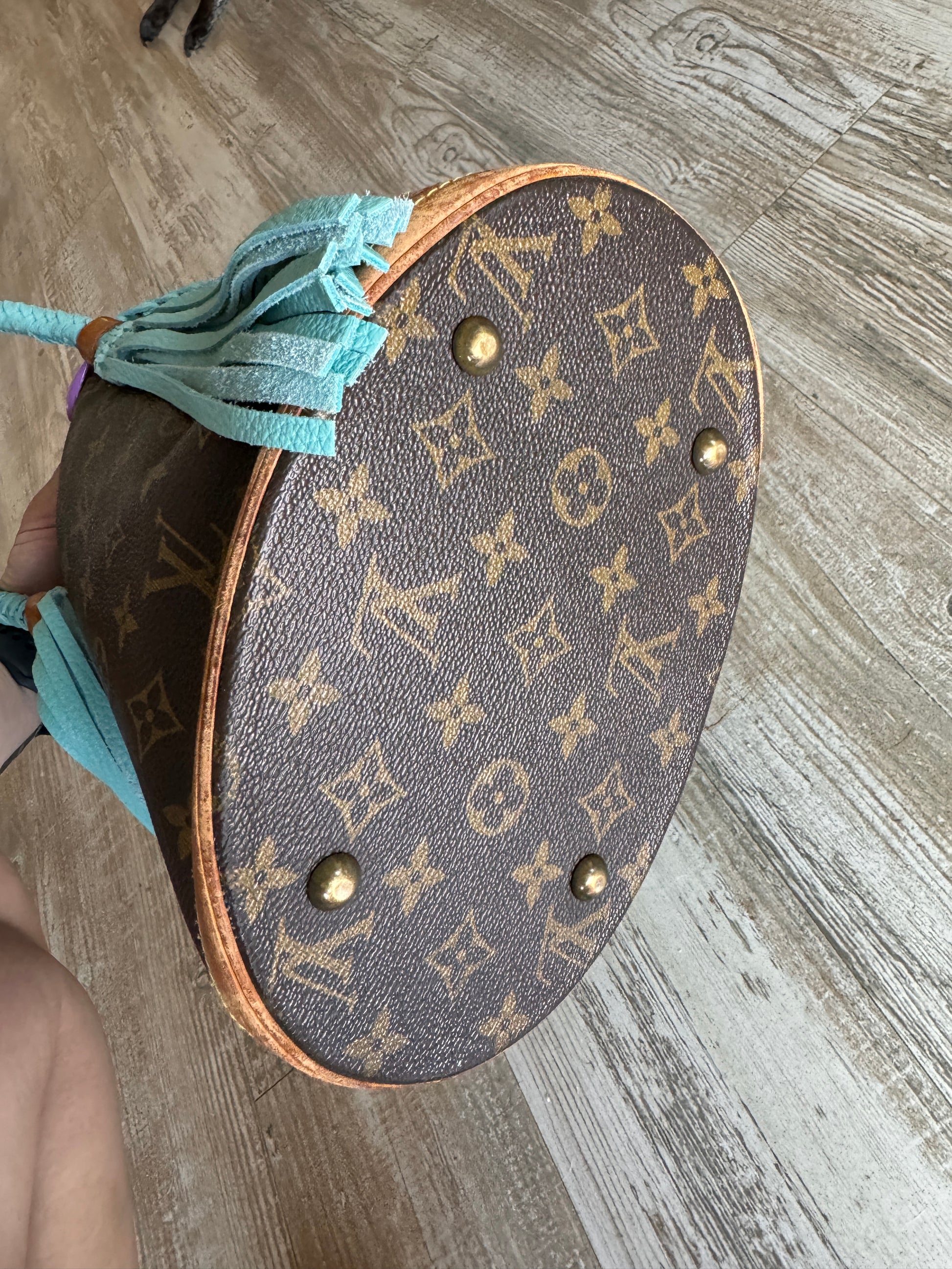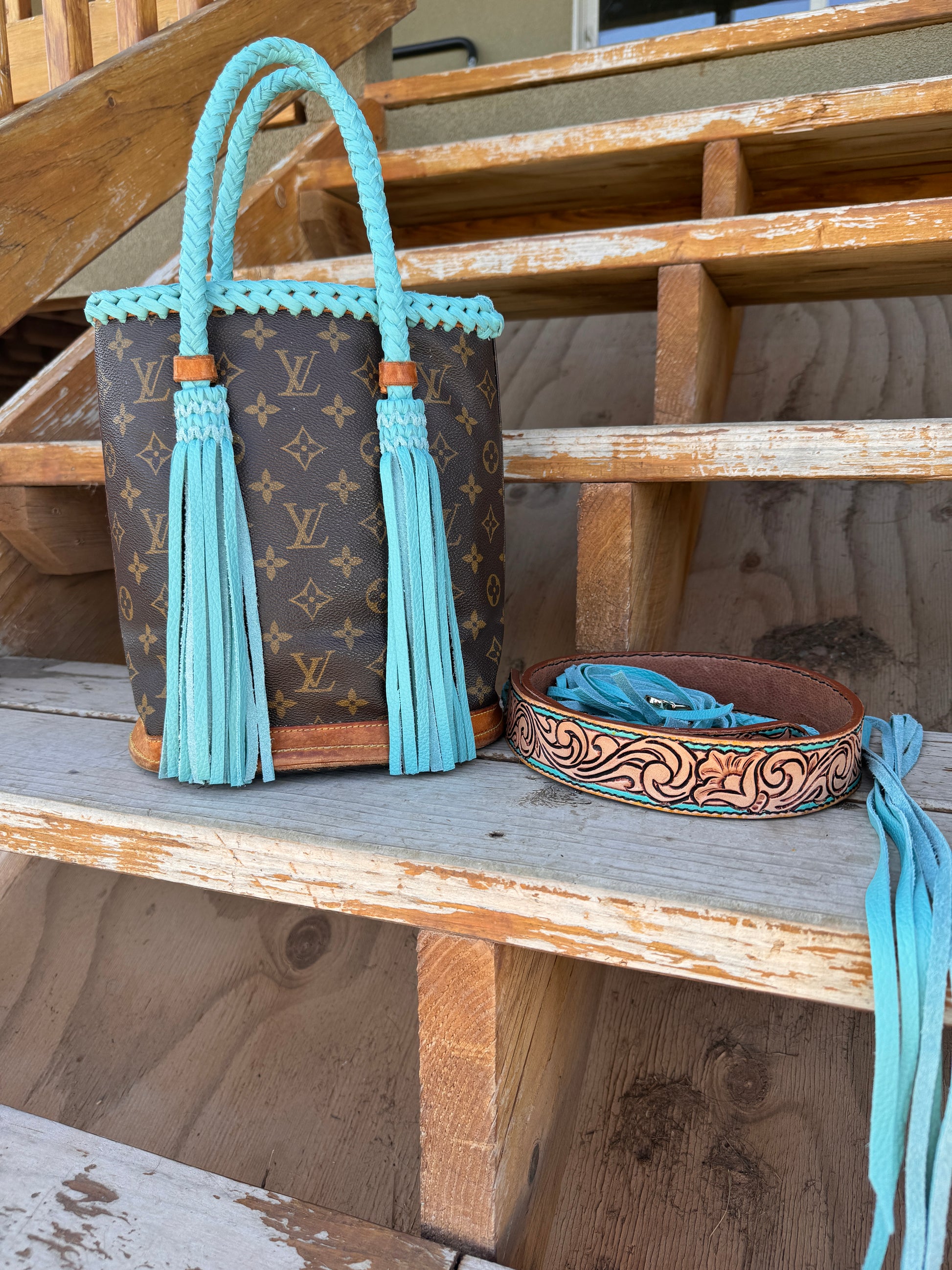 Authentic Louis Vuitton bucket bag braided and fringed in a turquoise mint color. (In some lights looks powder blue) was recently refined by Louis Vuitton so the inside is very clean. Comes with tooled strap 🩵🩵 approximately 10.5x9 by 6”