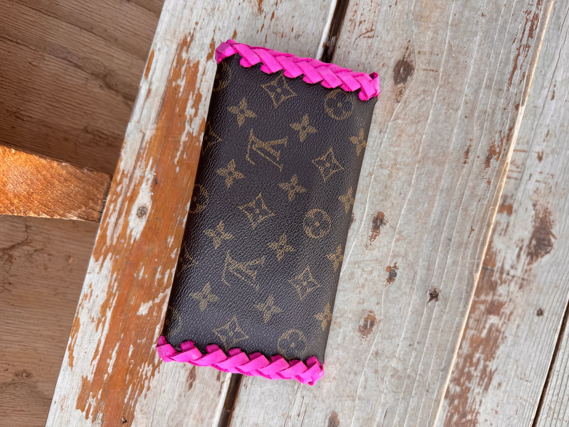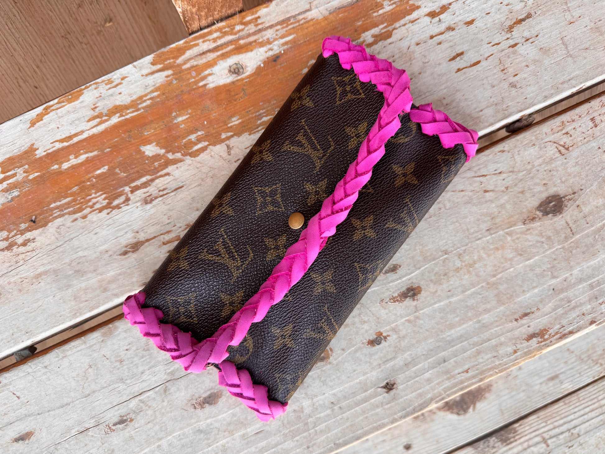 this wallet can also be used as a crossbody or clutch. Will come with an insert to add d rings and a crossbody strap. Interior is imperfect (reflected in the price) but still completely functional. (Just worn aka well loved) approximately 8x4.5”
