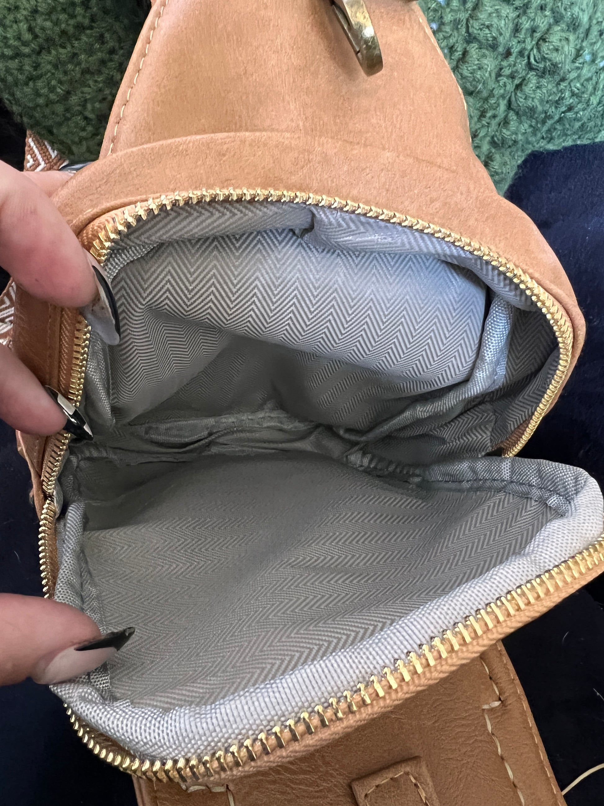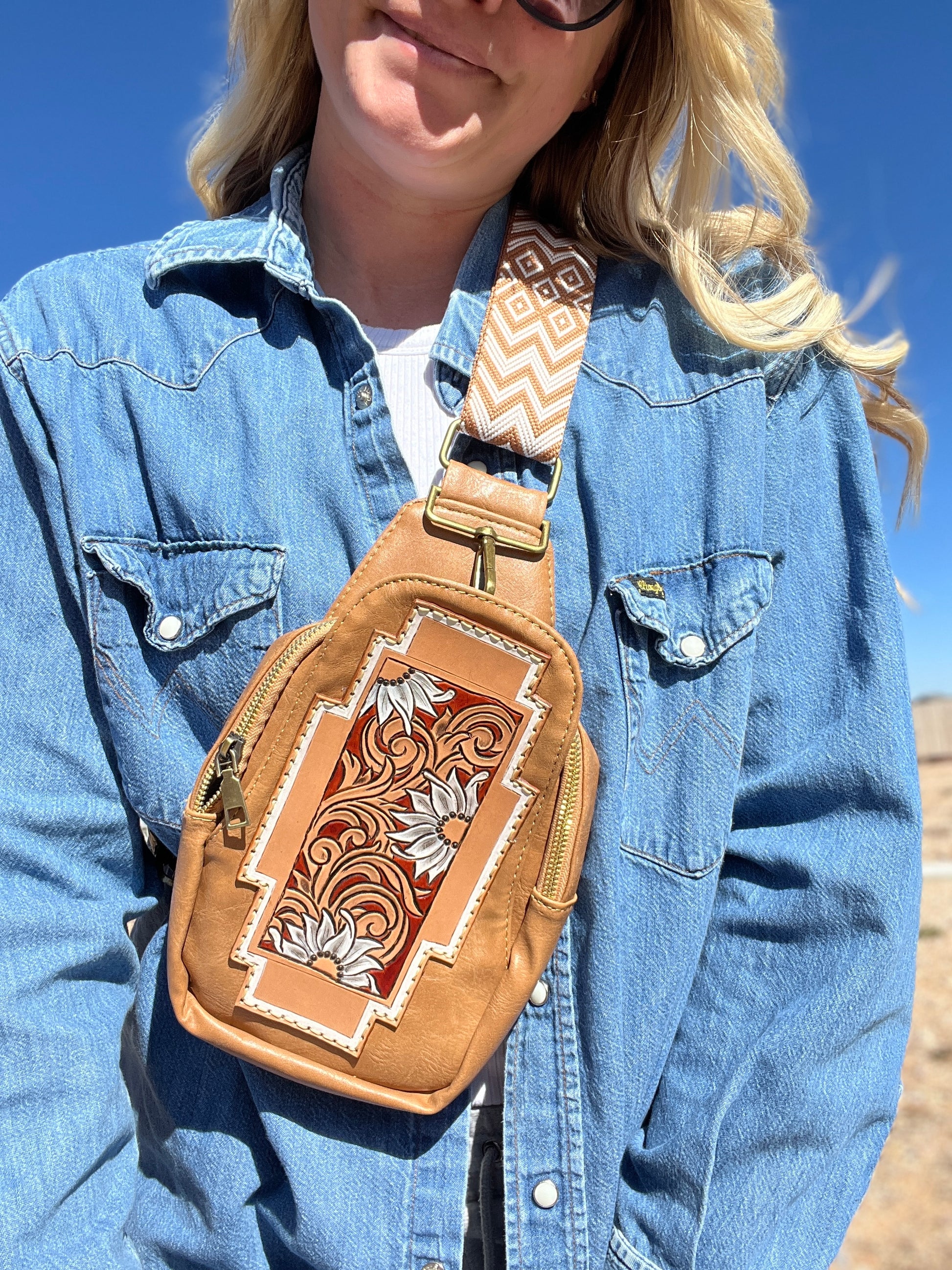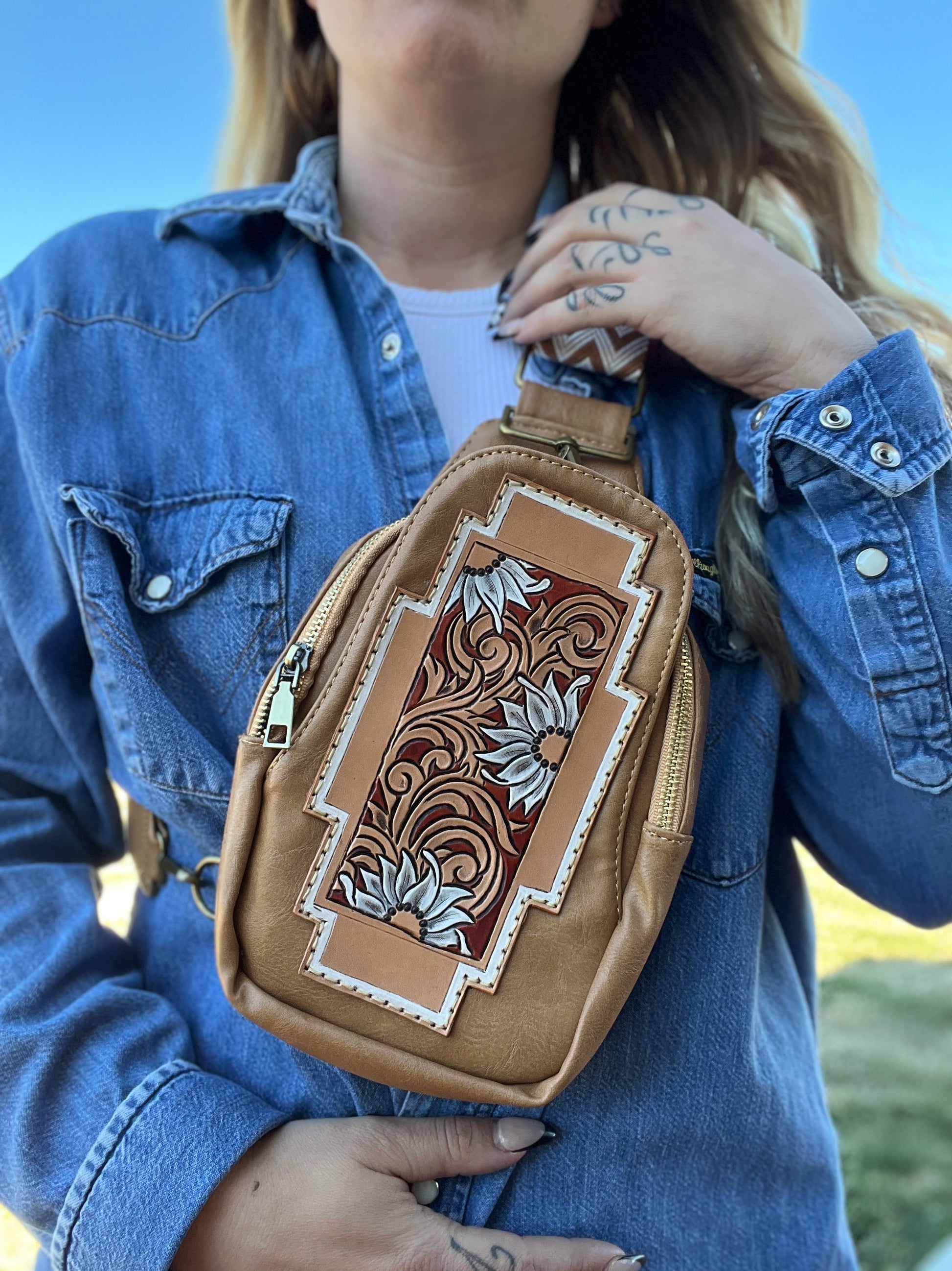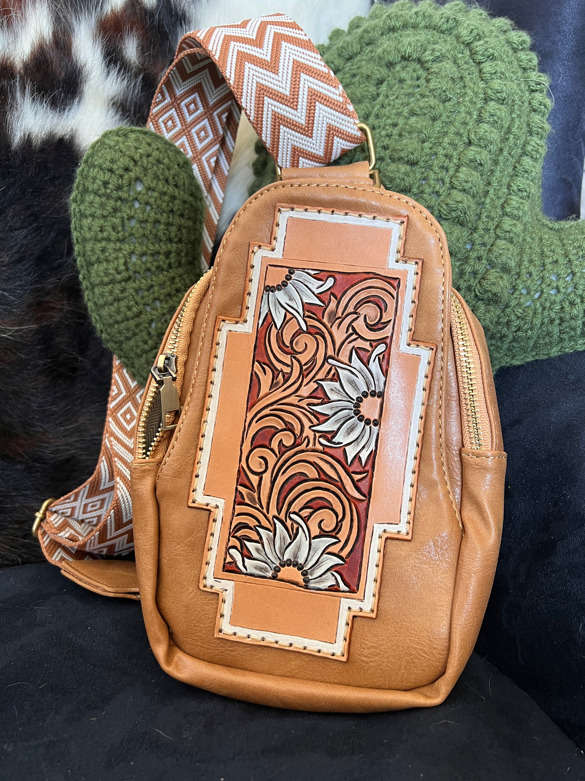 The Daisy lady along bag!! The bag it’s self is not leather. It is very soft with an adjustable strap. Approximately 10” tall x 6.5 wide and 1.5” deep