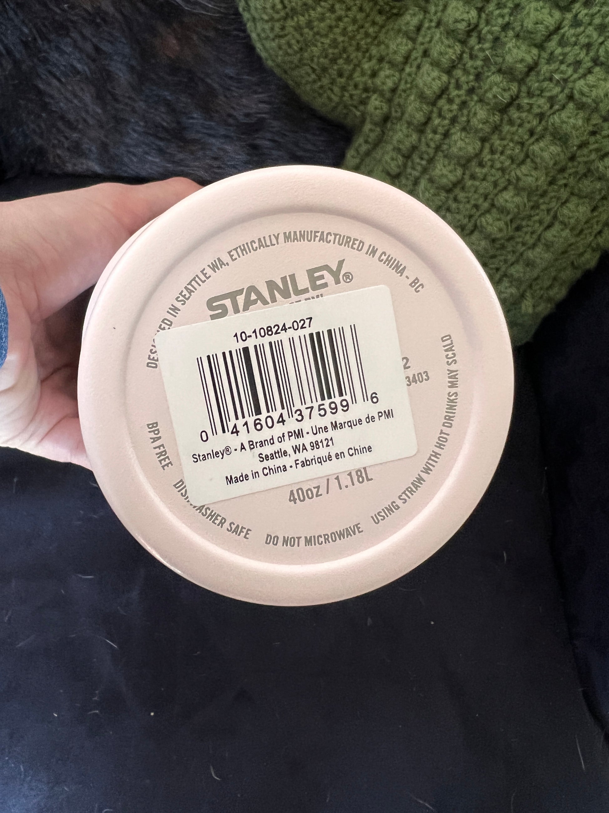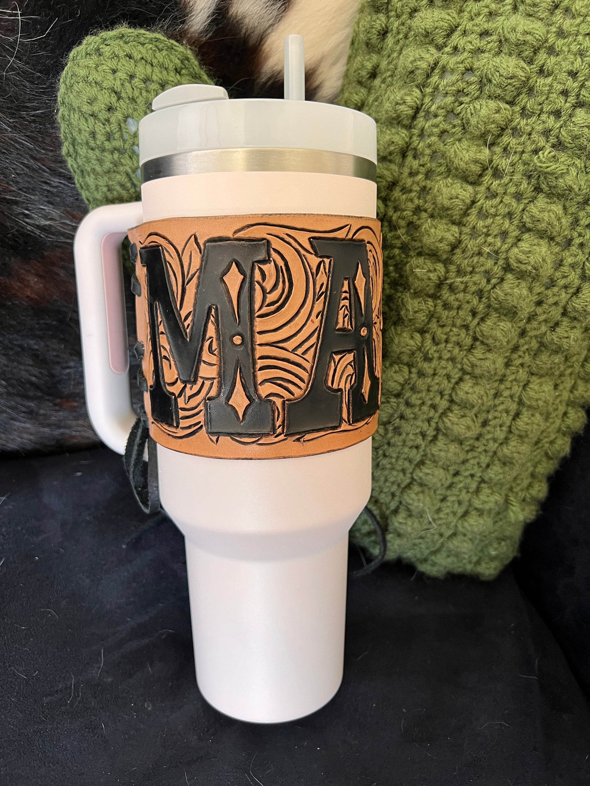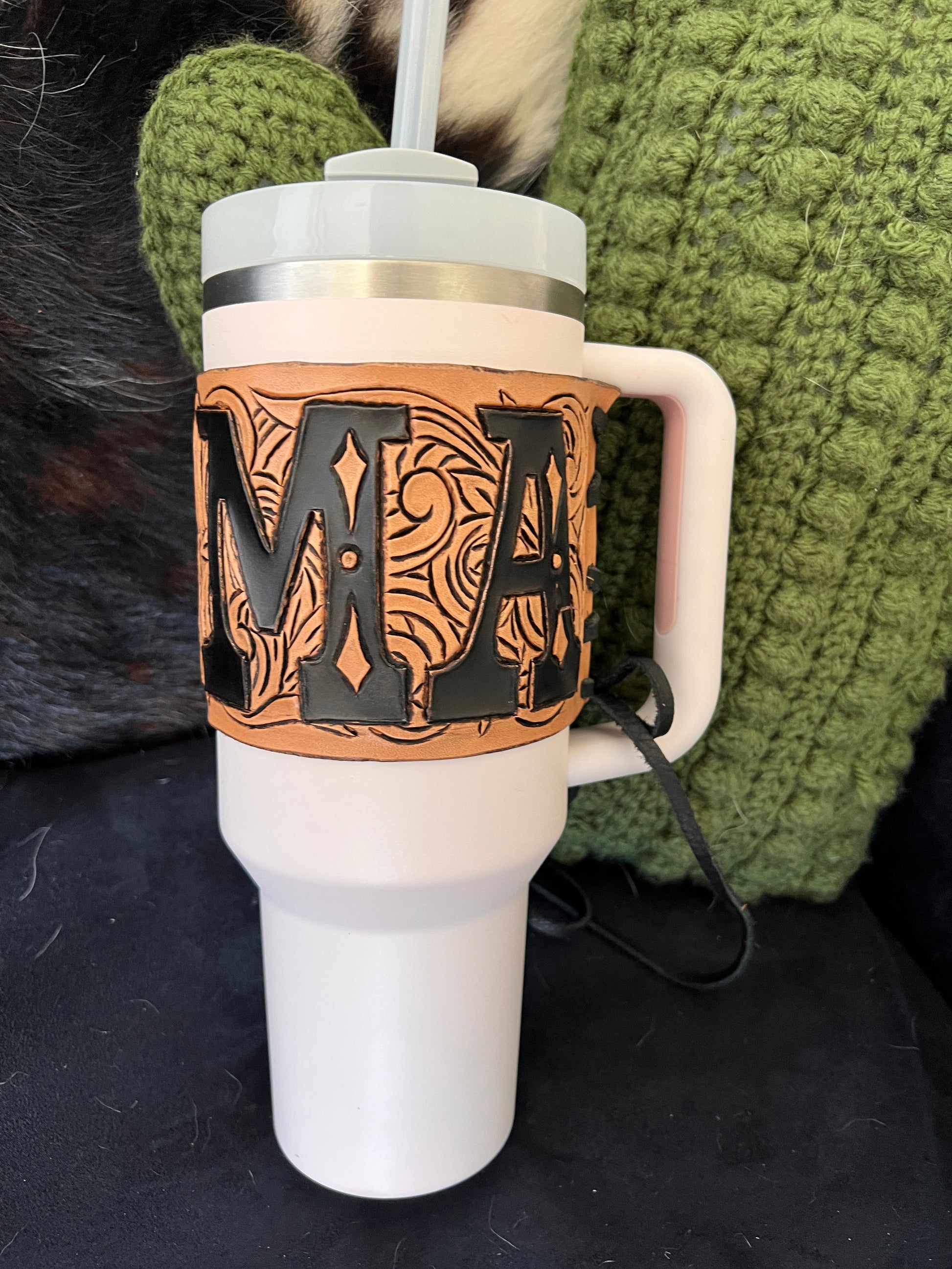 40 oz Stanley tumbler in color rose quartz with a hand tooled removable leather cuff.