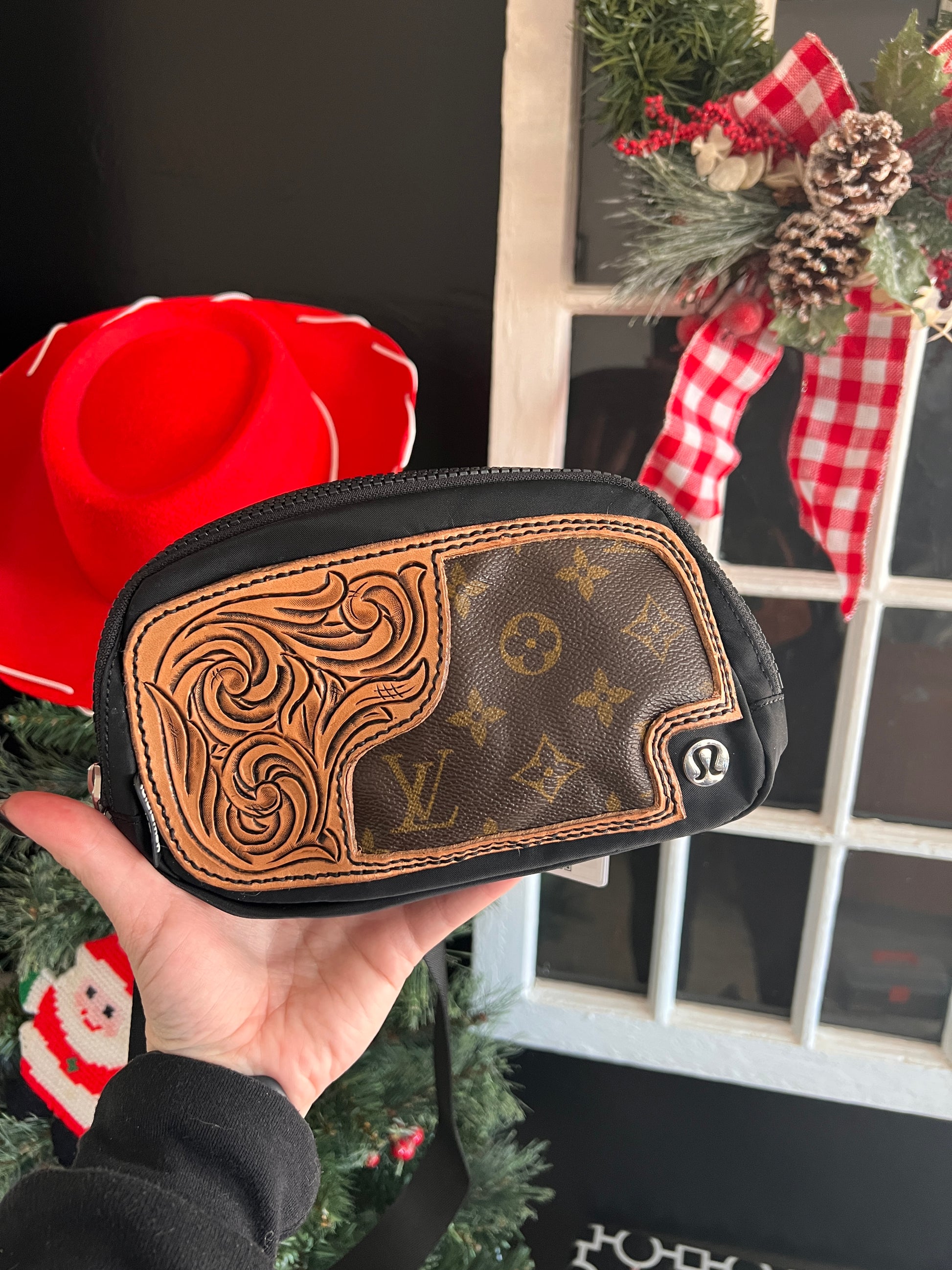 Tooled leather and authentic Louis Vuitton canvas patch on a lululemon belt bag. (7.5x2x5”)