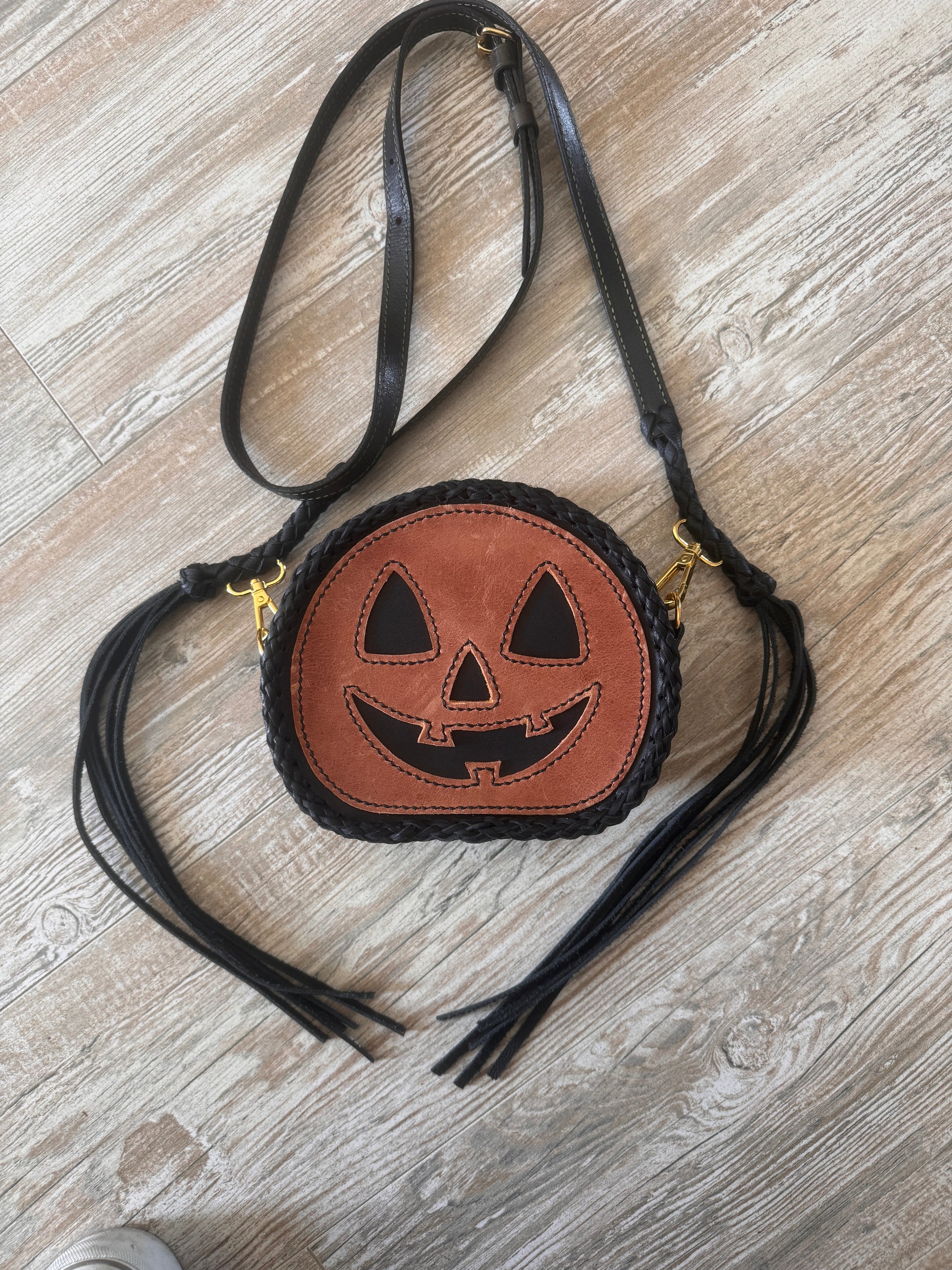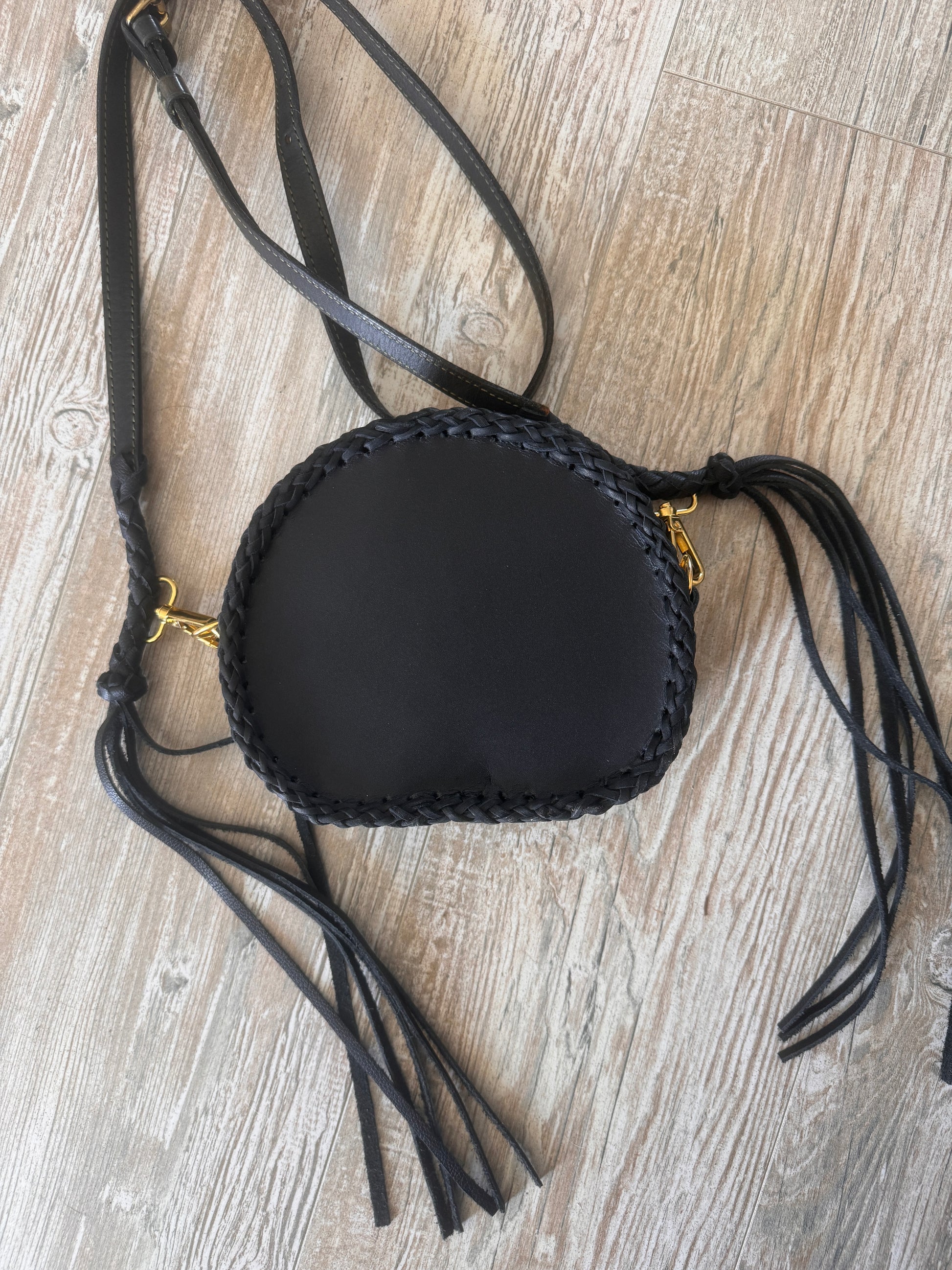 the fringe is on the adjustable strap. Strap is adjustable and 53”-23” long