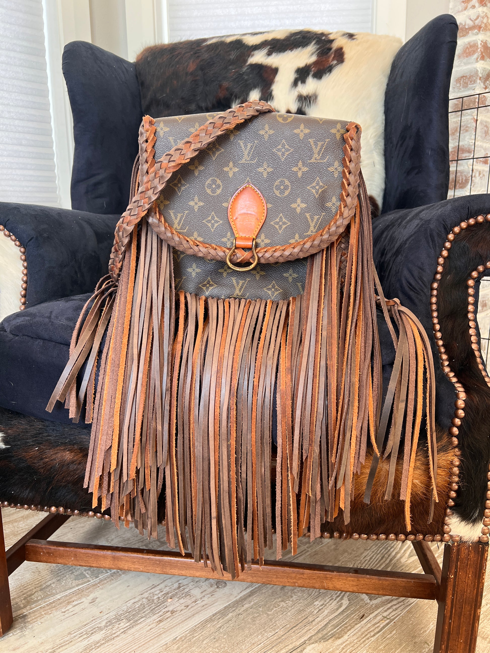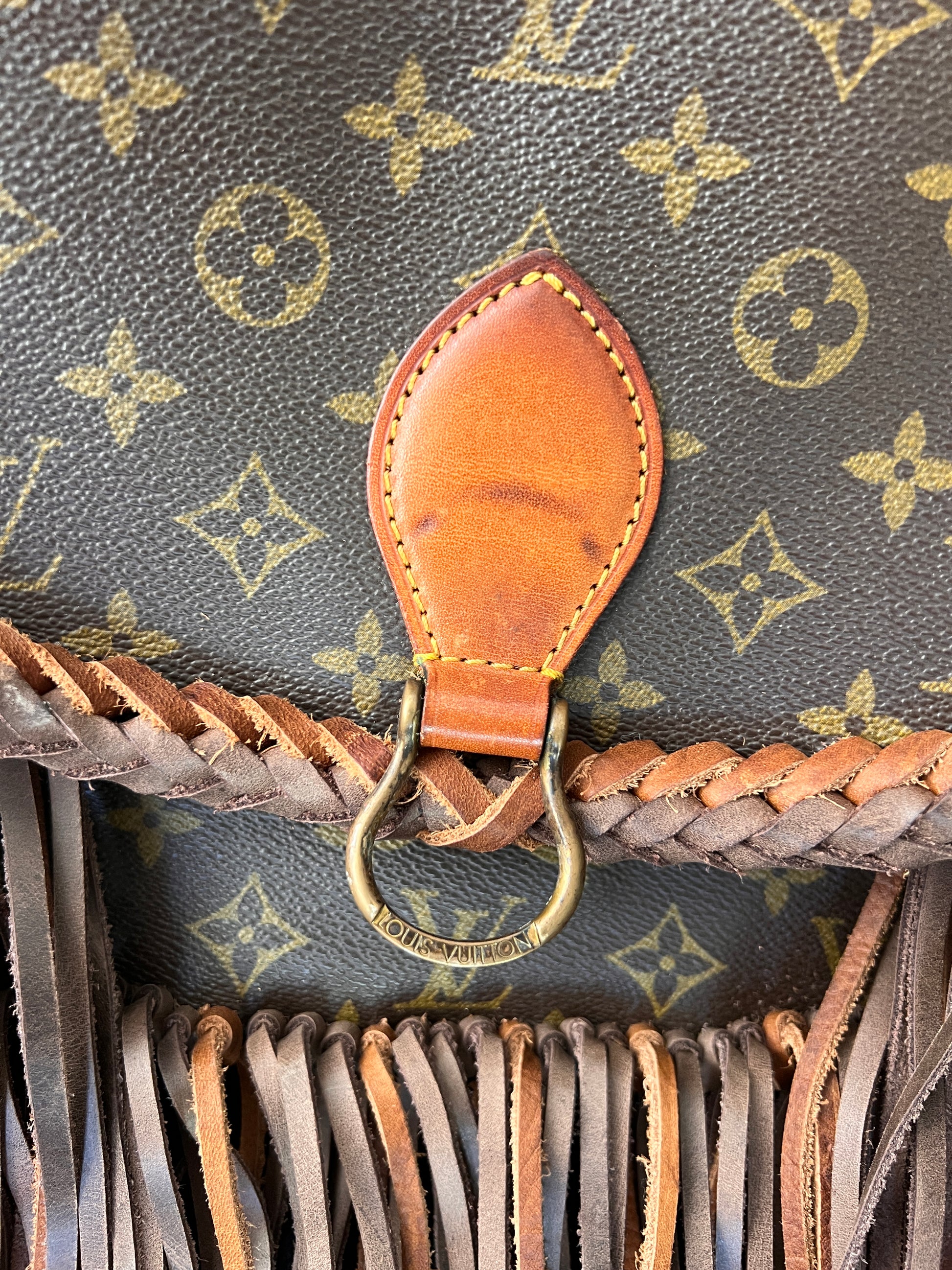 The biggest sized Saint Cloud double braided and fringed in a coffee and cream color way. Please note pockets are starting to flake but not sticky.