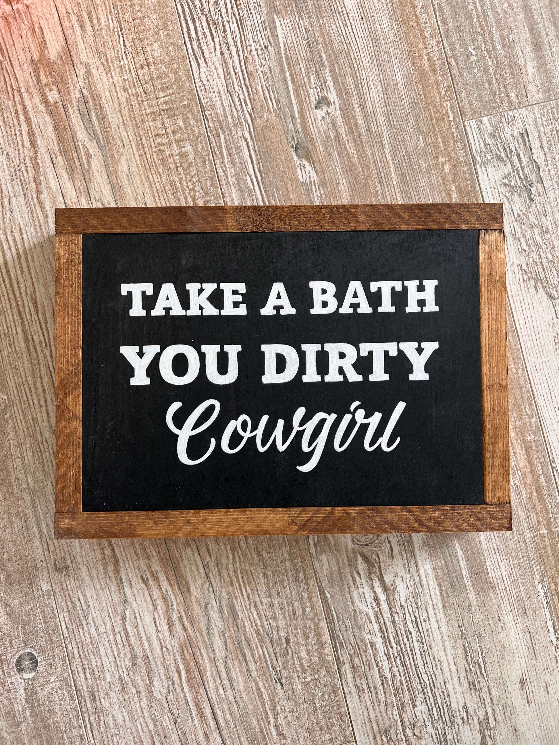 Take a bath you dirty cowgirl! Sign is hand painted (no sticker) 9x12.5”