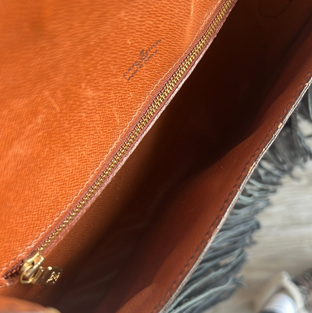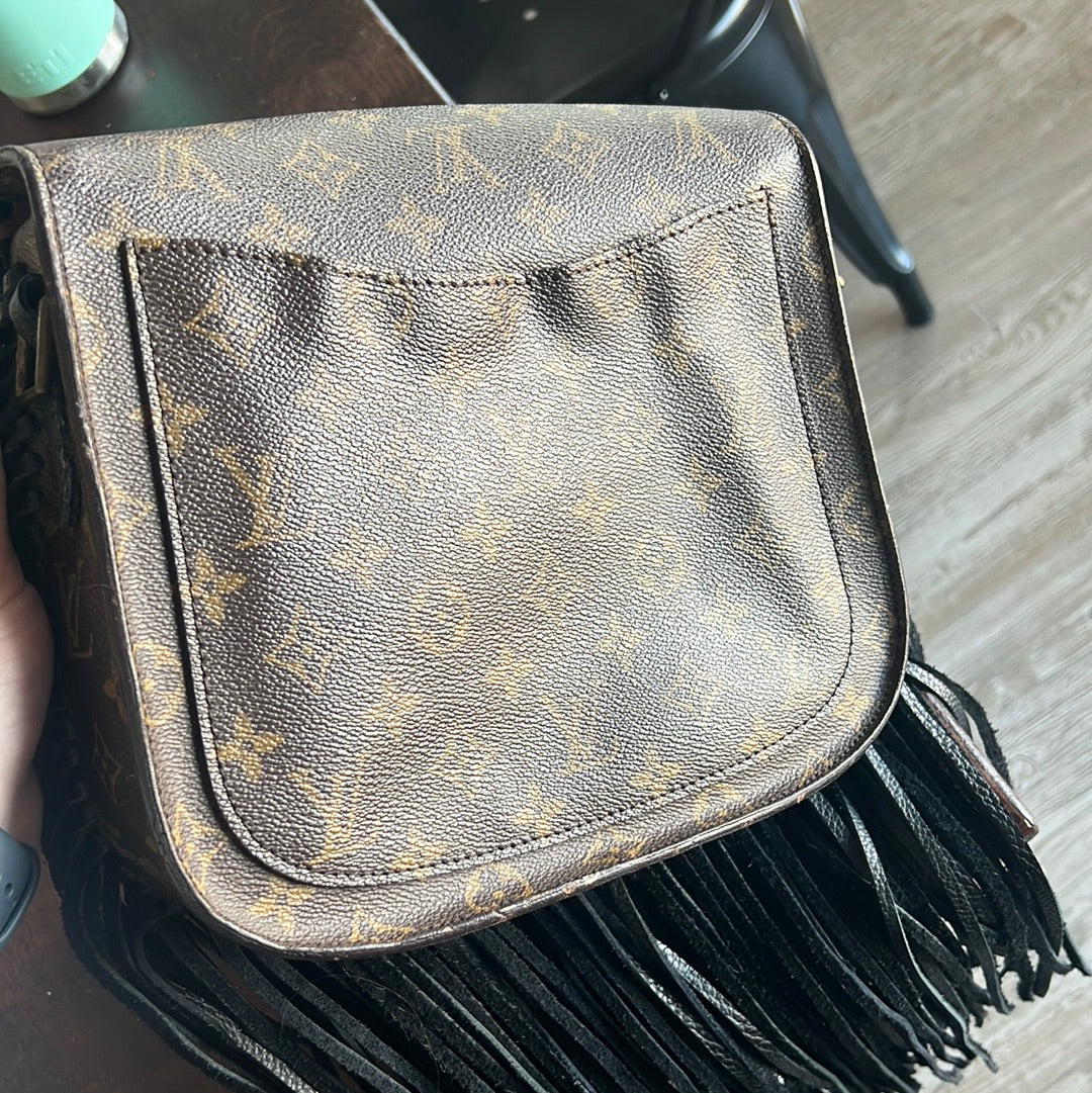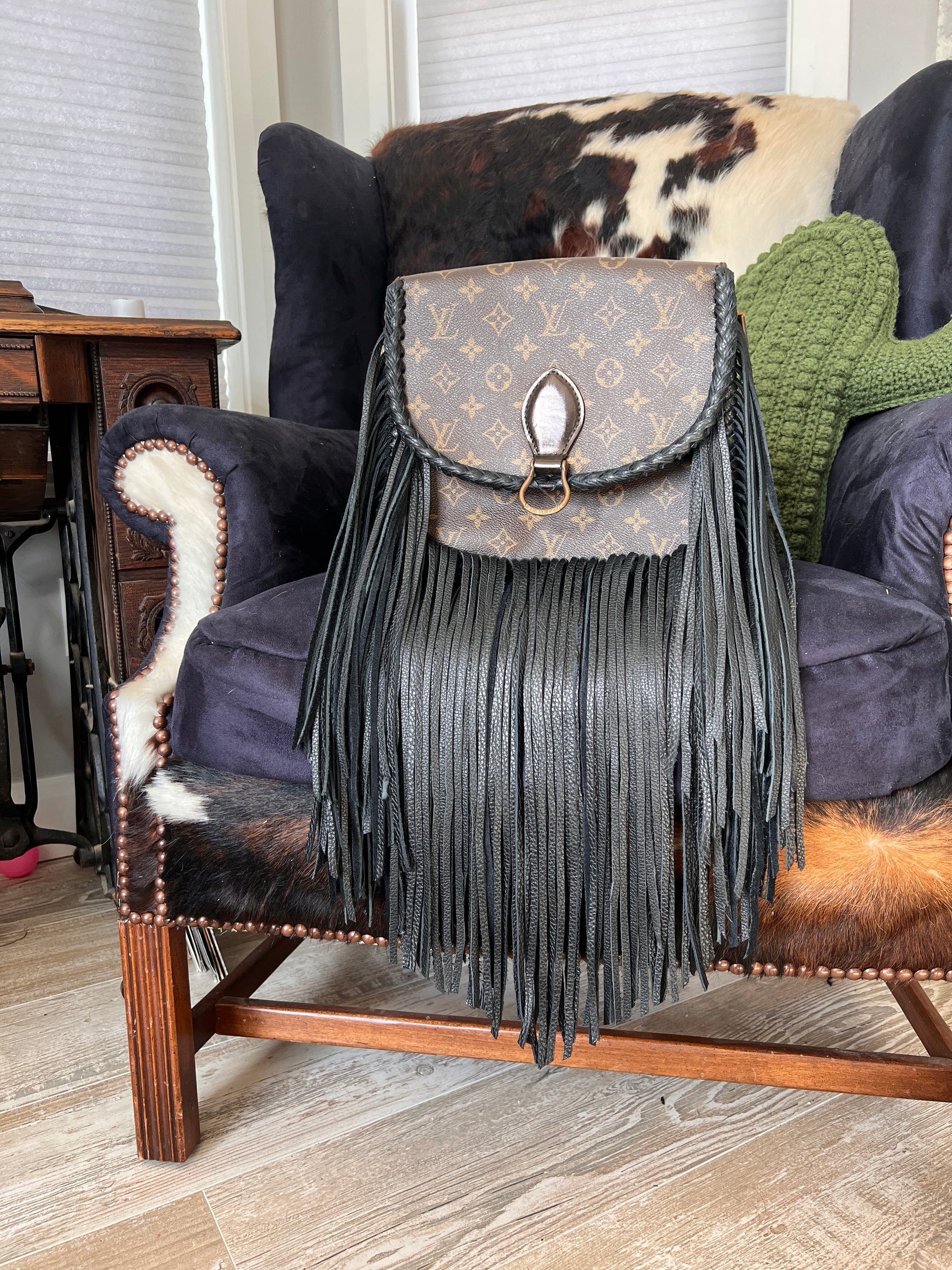 This Louis Vuitton Saint Cloud GM has been braided and fringed in all black. The back pocket as a little wrinkle to it but over all a clean and beautiful bag. 🖤