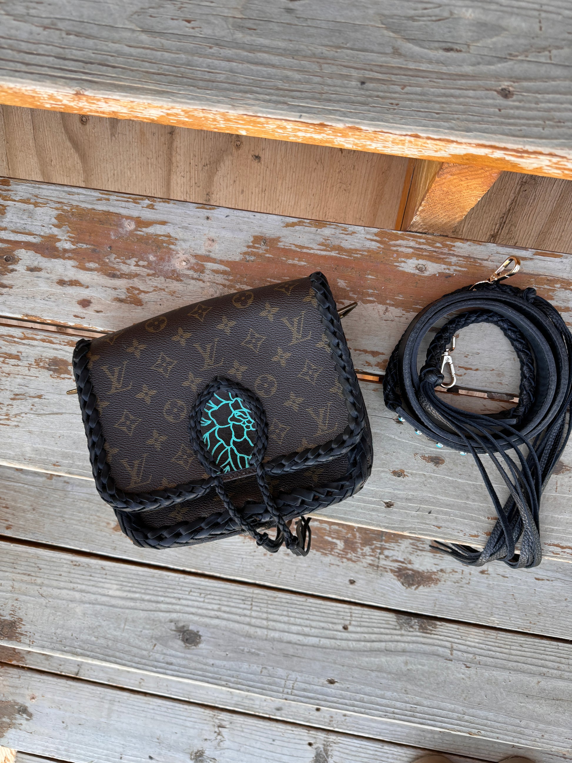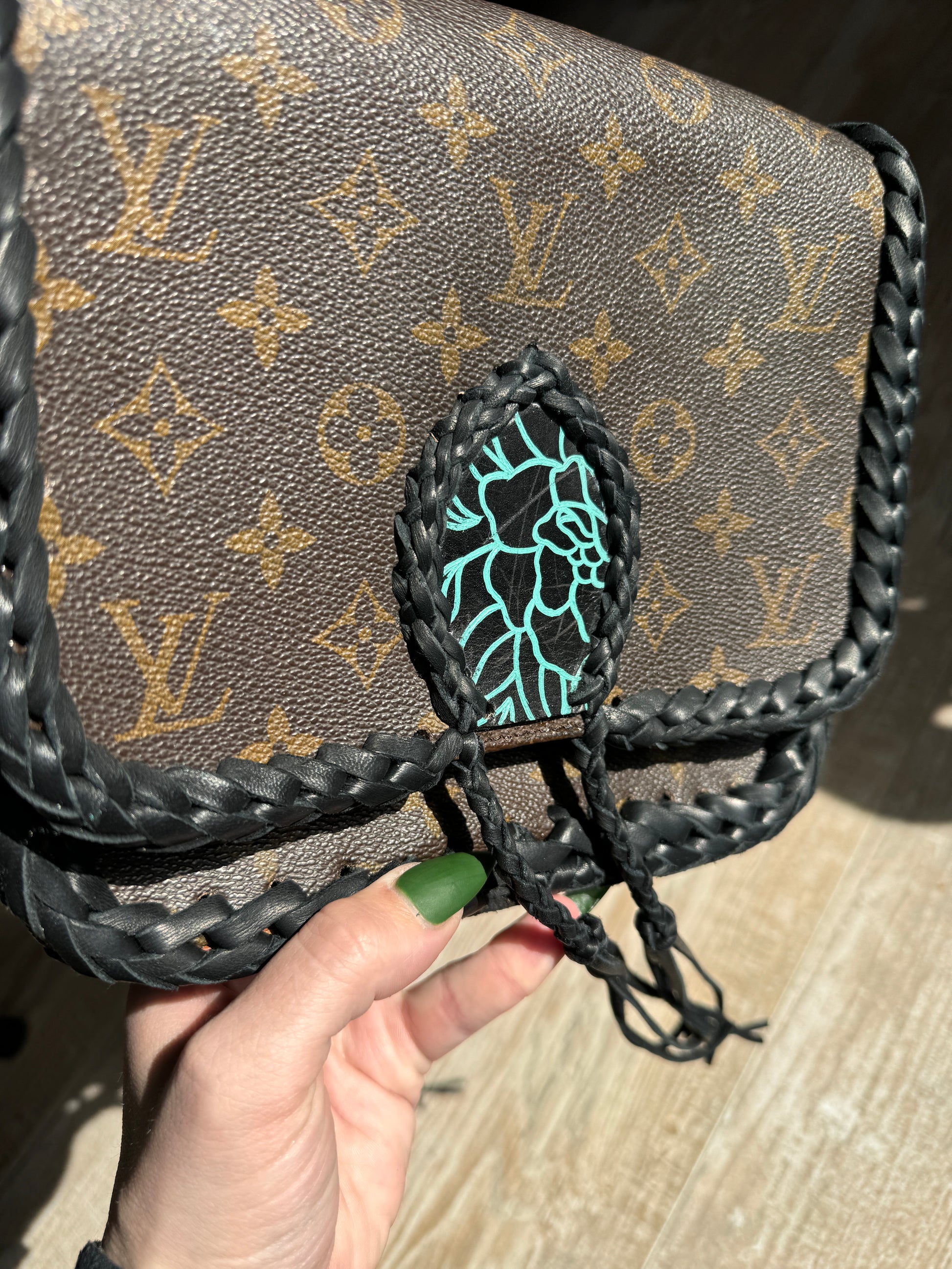 braided in black leather with hand painted flower detail on front and sides. Paint has been sealed and will not come off.