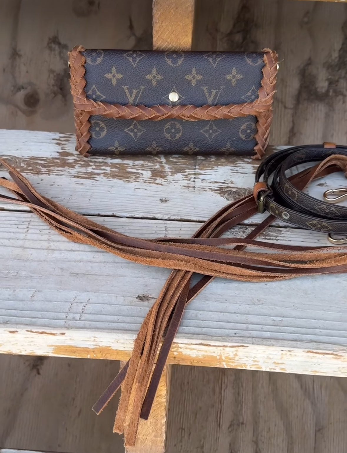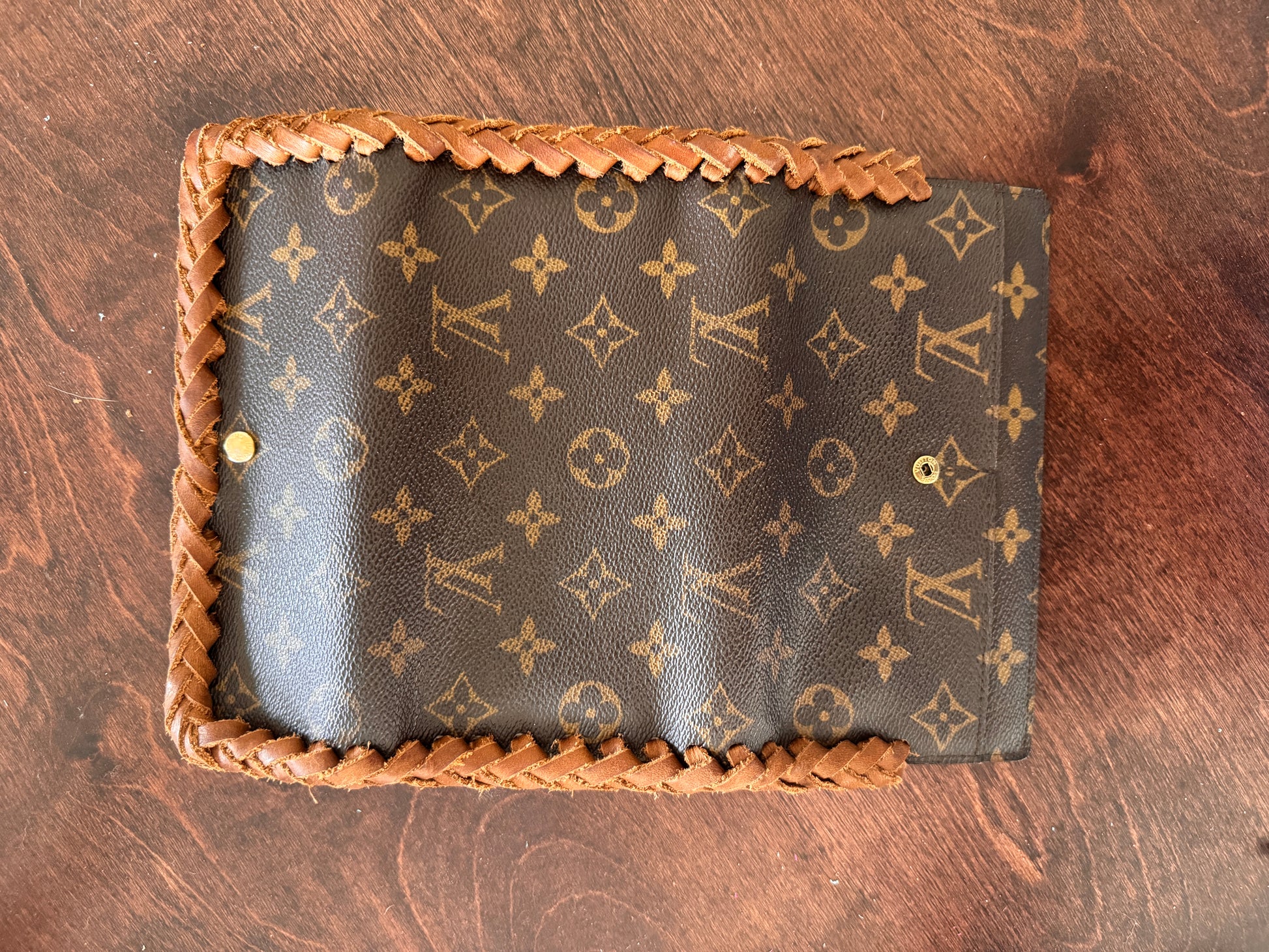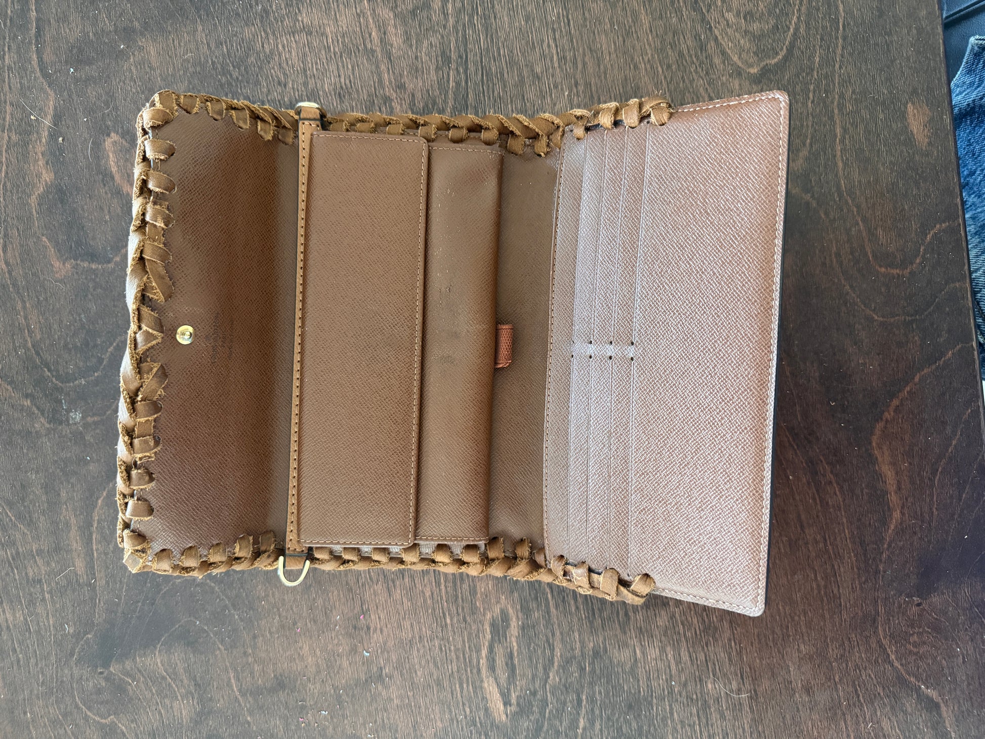 this wallet can also be used as a crossbody or clutch. Will come with an insert to add d rings and a crossbody strap. Interior shows minimal wear approximately 8x4.5”