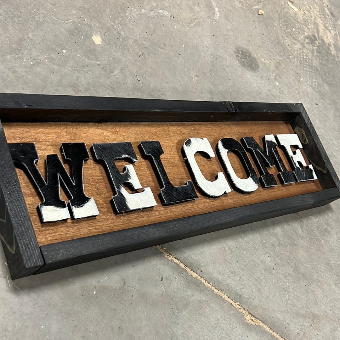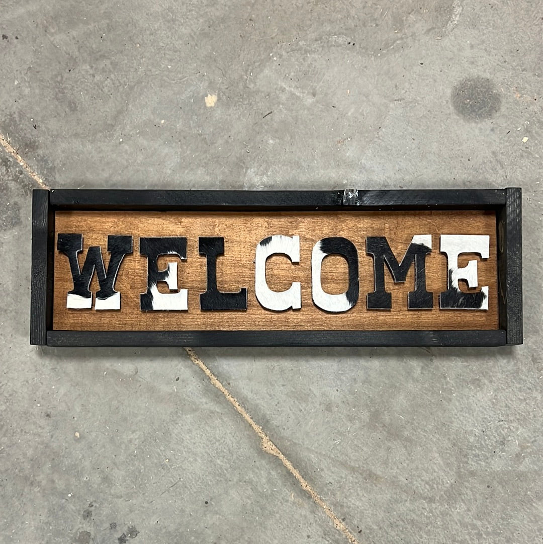 Black and white cowhide welcome sign 23.5x7.5”